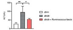 도 3b는 유전적 렙틴-결핍 동물 모델에서 루미노코쿠스 파에시스 투여에 따라 ALT 수준이 감소한 것을 나타낸 도면이다.