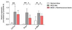 1c to 1e are diagrams showing that the histological severity of liver damage induced by MCD diet was significantly improved in mice fed Luminococcus phaesis.
