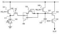 노광 동작에 대하여 설명한다.  시각 212에 리셋 신호선(RS_2)에 로 레벨 전위를 공급하여 리셋 트랜지스터(142)를 오프 상태로 한다.  또한, 리셋 신호선(RS_1)에 하이 레벨 전위를 공급하여 리셋 트랜지스터(141)를 온 상태로 한다.  이 때, 전송 신호선(TX)에 하이 레벨 전위가 공급되어 전송 트랜지스터(102)는 온 상태이지만 리셋 트랜지스터(141)도 온 상태이기 때문에 노드(111)의 전위는 저하되지 않는다.  한편, 노드(121)는 하이 레벨 전위를 유지한다.  다음에, 시각 213에 리셋 신호선(RS_1)에 로 레벨 전위를 공급하여 노광 동작을 시작한다.  포토다이오드(101)의 수광량에 따른 전하가 생성되어 노드(111) 및 노드(121)의 전위가 저하된다.  시각 214에 전송 신호선(TX)에 로 레벨 전위를 공급하면 노드(111)로부터 노드(121)로의 전하의 전송이 정지되어 노광 동작이 종료된다.  시각 214부터 시각 215까지의 기간에 포토다이오드(101)에서 전하가 생성되어 노드(111)의 전위는 계속 저하되지만 노드(121)는 시각 214에서의 노드(121)의 전위를 유지한다.The exposure operation will be described. At