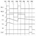 출력 동작에 대하여 설명한다.  시각 228에 선택 신호선(SE)을 하이 레벨로 하면 노드(121)에 유지된 전위에 따른 전압이 OUT로부터 출력된다.  시각 229에 선택 신호선(SE)을 로 레벨로 하면 OUT로부터의 출력이 정지된다.The output operation will be described. When the selection signal line SE is brought to the high level at