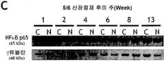 도 18A-B는 (A) 5/6 신장 절제에 의해 개시되는 진행성 CKD를 갖는 동물 및 (B) 일측 신장 절제에 의해 개시되는 비-진행성 신부전을 갖는 동물에서의 NFkB p65 아단위 (subunit)의 핵 국소화를 도시한다.  도 18C-D는 (C) 5/6 신장 절제를 겪은 루이스 래트 신장 조직의 추출물 중 NFkB p65에 대한 웨스턴 블롯 분석; 및 (D) 추출물에 대한 전기영동 이동 쉬프트 검정 (EMSA)를 나타낸다.  도 18E는 NKA (패널 A) 또는 비-생물활성 신장 세포 (패널 B)가 신장내 주사된 확립된 CKD를 갖는 루이스 래트로부터 수득된 조직에서의 NFκB p65 아단위의 면역조직화학 검출을 나타낸다.