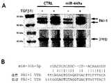 16A shows a Western blot in which total protein is prepared and assayed for PAI-1 and bactin. 16B depicts the microRNA miR-30b-5p.