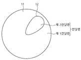 도 12에 나타낸 제9실시예에서는 돌출부(12)는 반구형으로 마련되어 있으며, 도 13에 나타낸 제10실시예에서는 돌출부(12)는 반구형이며 2개가 마련되어 있다. 또한 도 14에 나타낸 제11실시예에서는 돌출부(12)는 제1면을 가로지르도록 길게 형성되어 있으며 단면(연장방향의 가로방향)은 반원형이다. 제11실시예에서 돌출부(12)의 정점영역은 선형태로 길게 연장되어 있다.In the ninth embodiment shown in Fig. 12, the