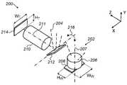카메라(200)와 같은 카메라의 동작은 미국 특허 출원 제14/455,906호에 보다 상세히 기술되어 있다. 특히, 프리즘은 도시된 바와 같이 X 축을 중심으로 기울기(회전) 운동(216)을 수행할 수 있다. 회전 운동은 도 3에 개략적으로 도시된 스텝핑 모터(302)에 의해 야기될 수 있다. 프리즘 회전 각도는 ±30 도의 FOVT 시프트에 대응하는, "제로" 위치(아래 참조)를 중심으로 한 -15 도에서 +15 도 사이의 범위일 수 있다. 카메라들(202 및 204)은 예를 들어, 도 1a 및 도 1b의 와이드 이미지 및 텔레 이미지를 각각 취하기 위해 사용된다.The operation of a camera, such as