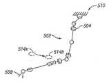 기계적 구조, 구성요소 또는 구성요소 조립체와 같은 부분과 관련되어 있는 "가요성(flexible)"이라는 용어는 폭넓게 해석되어야 한다. 본질적으로, 이 용어는 부분이 반복적으로 구부러질 수 있을 뿐만 아니라 부분에 대한 손상없이 원래 형상으로 복원될 수 있다는 것을 의미한다. 많은 "경질(rigid)" 물체들은 재료 특성 때문에 본질적으로 약간 탄력적인 "유연성(bendiness)"을 가지는데, 이는 이러한 물체들이 본 명세서에서 사용되는 용어와 같이 "가요성"으로 여겨지지는 않더라도 그러하다. 가요성 부분은 무한한 자유도(degrees of freedom; DOF's)를 가질 수 있다. 이러한 부분들에 관한 예시들은, 종종 단면 변형이 크게 없이도 간단하거나 복합적인 여러 가지 곡선들로 구부러질 수 있는 (예컨대 니티놀, 폴리머, 연질 고무 및 이와 유사한 것으로 만들어지는) 폐쇄형으로 구부러지는 튜브, 나선형 코일 스프링 등을 포함한다. 다른 가요성 부분들은 연속적인 "척추골(vertebrae)"의 뱀과 같은 배열과 유사한, 일련의 근접 이격 구성요소들을 이용함으로써 이러한 무한 DOF 부분에 가까울 수 있다. 이러한 척추골 배열에서, 각각의 구성요소는 운동형상학적 사슬(kinematic chain)의 짧은 링크이고, 각각의 링크 사이의 가동 기계적 제약들(예컨대 핀 힌지, 컵 앤 볼, 라이브 힌지 및 이와 유사한 것)은 링크들 사이에서의 상대적인 움직임에 관한 1 자유도(예컨대 피치) 또는 2 자유도(예컨대 피치와 요)를 허용할 수 있다. 짧은 가요성 부분은, 그 자체가 몇개의 결합된 링크들로 만들어진 운동형상학적 사슬일지라도, 운동형상학적 사슬의 2개의 링크들 사이에서 하나 이상의 자유도를 제공하는 단일의 기계적 제약(조인트)으로 서비스제공하거나 이와 같이 모형화될 수 있다. 부분의 가요성이 그 강성(stiffness)의 관점에서 표현될 수 있다는 점을 통상의 기술자라면 알 수 있을 것이다.The term "flexible" in reference to a part, such as a mechanical structure, component, or component assembly, should be interpreted broadly. Essentially, the term means that a part can be bent repeatedly, as well as restored to its original shape without damage to the part. Many "rigid" objects have a "bendiness" that is inherently slightly resilient because of the material properties, even if such objects are not considered "flexible" as the term is used herein. The flexible portion may have infinite degrees of freedom (DOF's). Examples of these parts are closed-bending tubes (e.g., made of nitinol, polymers, soft rubber and the like) that can be bent into a variety of simple or complex curves without significant cross-sectional deformation, often spiral coil springs and the like. Other flexible portions may approximate this infinite DOF portion by using a series of closely spaced components, similar to a snake-like arrangement of continuous “vertebrae”. In this vertebral arrangement, each component is a short link of a kinematic chain, and the movable mechanical constraints between each link (eg pin hinge, cup and ball, live hinge and the like) are linked It may allow one degree of freedom (eg pitch) or two degrees of freedom (eg pitch and yaw) with respect to relative movement between them. A short flexible part serves as a single mechanical constraint (joint) that provides one or more degrees of freedom between the two links of a kinematic chain, even if it is itself a kinematic chain made of several joined links. Or it can be modeled like this. It will be appreciated by those skilled in the art that the flexibility of a part can be expressed in terms of its stiffness.