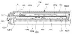 다양한 실시예에 따르면, 상기 전자 장치(1200)는 상기 관통홀(1217)과 상기 소켓(1251) 사이에 배치된 가압 부재(1205)를 포함할 수 있다. 상기 트레이(1203)가 상기 하우징(1201)에 완전히 삽입된 상태에서는, 대체로, 상기 저장 매체(1241, 1243)들이 대부분 상기 소켓(1251)의 내부에 수용될 수 있다. 상기 트레이(1203)가 상기 하우징(1201) 및/또는 상기 소켓(1251)으로 삽입/취출되는 동안, 상기 가압 부재(1205)는 상기 관통홀(1217)과 상기 소켓(1251) 사이에서, 상기 저장 매체(1241, 1243)들을 가압하거나 상기 저장 매체(1241, 1243)들의 유동 범위를 제한함으로써, 상기 트레이(1203)의 삽입/취출을 원활하게 할 수 있다.According to various embodiments, the