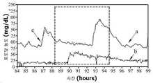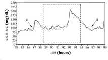 도 46은 간섭물 제거 실행을 하면서 측정 시간 구간에 걸쳐 신체 내 포도당의 측정 결과를 도시하기 위한 포도당 농도 대 시간 커브의 그래프 곡선이며, 여기에서 점선 프레임으로 표시된 부분은 의학적 간섭의 시간 구간을 나타내며, 커브 (a)는 제1 작업 전극의 측정 결과를 나타내며, 커브 (b)는 제2 작업 전극의 측정 결과를 나타내며, 그리고 복수의 점들 (c)는 분석 도구를 사용하여 통상적인 테스트 스트립으로 측정된 포도당 농도 값들을 나타낸다.