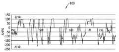 도 1은 퓨즈, 특히 그 내부의 부하 전류 순환 피로에 영향을 받기 쉬운 퓨즈 소자 또는 소자들을 제공하는 전기 자동차 전력 시스템 애플리케이션에서의 예시적인 전류 구동 프로파일(100)을 도시한다.   도 1에서, 전류가 수직 축으로 도시되고  시간이 수평 축으로 도시된다.  일반적인 전기 자동차 전력 시스템 애플리케이션에서 전력 퓨즈는 회로 보호 장치로 사용됨으로써 전기적 오류 조건으로 인한 전기 부하의 손상을 방지한다.  도 1의 예를 고려하면, 전기 자동차 전력 시스템은 상대적으로 짧은 시간 동안 전류 부하에 있어 큰 편차가 발생하기 쉽다.  전류의 변화는 전기 자동차(EV) 차량의 운전자의 행동, 교통 상황 및/또는 도로 상황에 기초하여 일견 무작위적인 운전 습관에 의해 생성된 순서대로 다양한 크기의 전류 펄스를 생성한다.  이로써 전기 자동차 구동 모터, 1차 구동 배터리 및 시스템 내에 포함된 모든 보호 전력 퓨즈 상에 실질적으로 무한하게 다양한 전류 부하 사이클을 생성한다.1 shows an exemplary