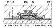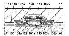 또한, 트랜지스터(150) 위에는 층간 절연층(116) 및 층간 절연층(118)이 설치되어 있다.  여기서, 층간 절연층(116) 및 층간 절연층(118)은 필수의 구성요소는 아니므로, 적당히 생략될 수도 있다는 점에 유의한다.In addition, an