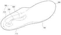 추가로, 바닥층(100) 저면의 전방 외측 부분에는 복수 개의 패턴홈(150)이 함몰 형성될 수 있으며, 이러한 패턴홈(150)은 디자인적 요소를 가미하면서, 바닥층(100)의 저면에 신발 갑피 내부에 삽입된 후 밀착력 향상에 도움을 줄 수도 있다.In addition, a plurality of