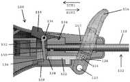 도 1b와 도 1c를 참조하면, 일 실시예에서, 기다란 샤프트(102)는 손잡이(108) 상의 액추에이터(114)(예컨대, 관절운동 레버)와 연결되는 외측 시스(118)를 포함한다.  외측 시스는 스테인리스강과 같은 내구성의 생체적합성 재료로 제조될 수 있다.  일 실시예에서, 관절운동 레버(114)의 하부 단부가 피벗(120)을 통해 손잡이(108)의 본체와 피벗가능하게 연결된다.  어플리케이터 기구(100)는 또한 핀(126)을 통해 관절운동 레버(114)와 연결되는 근위 단부(124)를 갖는 관절운동 텐셔너(tensioner)(122)를 포함한다.  관절운동 텐셔너(122)는 레버(130)와 맞닿도록 구성되는 근위 단부(128)를 구비한다.  일 실시예에서, 레버(130)는 핀(134)을 통해 손잡이의 본체와 피벗가능하게 연결되는 상부 단부(132), 및 관절운동 텐셔너(122)의 근위 단부(128)와 접촉되도록 구성되는 자유 하부 단부(136)를 구비한다.  일 실시예에서, 관절운동 텐셔너(122)가 근위방향으로(즉, 도 1a와 도 1b에서 좌측으로) 이동할 때, 레버(130)의 하부 단부(136)는 레버가 핀(134)을 중심으로 피벗함에 따라 시계 방향으로 밀린다.Referring to FIGS. 1B and 1C , in one embodiment, the