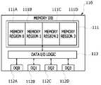 본 예에서 메모리 영역들(111A, 111B, 111C, 111D)의 구분은, 메모리 미디어(110) 외부와의 데이터 전송이 어떤 데이터 입/출력 핀을 통해 이루어지는지에 따라 이루어진다. 일 예에서, 첫번째 메모리 영역(memory region 0)(111A)은 첫번째 데이터 입/출력 핀(DQ0)(112A)을 통해 데이터 입/출력이 이루어지는 영역으로 한정될 수 있다. 두번째 메모리 영역(memory region 1)(111B)은 두번째 데이터 입/출력 핀(DQ1)(112B)을 통해 데이터 입/출력이 이루어지는 영역으로 한정될 수 있다. 세번째 메모리 영역(memory region 2)(111C)은 세번째 데이터 입/출력 핀(DQ2)(112C)을 통해 데이터 입/출력이 이루어지는 영역으로 한정될 수 있다. 네번째 메모리 영역(memory region 3)(111D)은 네번째 데이터 입/출력 핀(DQ3)(112D)을 통해 데이터 입/출력이 이루어지는 영역으로 한정될 수 있다.In this example, the