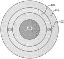 열 발산을 추가로 용이하게 하기 위해, VCSEL(400)은 활성 영역(402)에 근접하게 (즉, VCSEL 내의 발열 양자 우물 구조에 가깝게) 금속 링 전극들(420, 424)을 포함한다.  도시된 실시예에서의 링 전극들(420, 424)은 각각 DBR들(404, 406) 아래에 침착되고, 금속 비아들(422)에 의해 DBR 층들(412, 414)의 스택들을 통해 전기 접촉부들(416, 418)에 각각 접속된다.  링 전극들은 높은 전기 전도율 및 높은 열 전도율 둘 모두를 갖는 금속, 예를 들어, 금을 포함한다.  그들은 활성 영역(402)에 여자 전류를 전달하고 활성 영역으로부터 열을 제거하는 이중 목적을 제공하며, 따라서 접합부 온도를 낮추고 VCSEL의 벽-플러그(wall-plug) 효율을 증가시킨다.  단지 2개의 비아들(422)이 도 10b의 단면도에 도시되어 있지만, 더 많은 수의 비아들이 열 방출의 목적을 위해 필요에 따라 형성될 수 있다.  대안적인 실시예(도면에 도시되지 않음)에서, 이러한 종류의 링 전극은 활성 영역(402)의 일 측 상에만 내장될 수 있으며, 이때 (예를 들어, 선행하는 실시예에서와 같은) 외부 전극은 다른 측 상에 있다.To further facilitate heat dissipation,