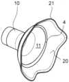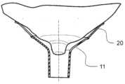 2개의 벽이 2개의 접촉면(12, 22)으로 병합되는 단차의 경사각(β)은 바람직하게는 30도 내지 70도이고, 더 바람직하게는 45도이다.  외부면에서의 증가량(d)은 상기 연결 영역에서 0.5 내지 1.5 mm이다.  깔때기(11)와 칼라(2)의 벽 두께는 적어도 연결 영역에서 동일하다.  도 10a와 10b의 예시에서, 이것은 인접 영역에도 적용된다.The inclination angle β of the step at which the two walls merge into the two