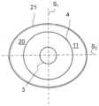 레이온 에지(21)의 3차원 곡선은 임의의 방식으로 형성될 수 있다.  상기 예시에서, 브레스트 쉴드의 종방향 중심축(Lτ)에 수직한 사영은 도 3에 볼 수 있는 바와 같이 타원이다.  따라서, 사영은 정확히 2개의 대칭 축(S1, S2)을 포함한다.  레이온 에지(21)와 이에 따라 칼라(2)는, 2개의 대칭 축을 포함하고 도면 평면에 수직하게 연장되는 정확히 2개의 대칭 평면을 포함한다.  따라서, 상기 대칭 평면들은 또한 참조번호 S1 및 S2를 가진다.The three-dimensional curve of the