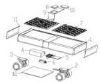캐링 어셈블리(1)의 크기, 형상, 재질은 다양한 옵션이 존재할 수 있으나 설명의 편의를 위해 본 실시예에서는 대나무 재질을 선택하여 길이 59cm, 폭 31cm, 높이 7cm인 하우징 형상으로 제조하여 장착시 모터 및 브릿지 어셈블리(2), 종동 휠 및 브릿지 어셈블리(3)를 덮을 수 있으며, 캐링 어셈블리(1)의 하부에서 격판을 사용하여 길이 20cm, 폭 29cm, 높이 4cm인 캐비티를 형성하고, 상기 캐비티에는 전원 어셈블리(4), 마스터 제어 보드 어셈블리(5), 스피커(6) 등이 수용 및 장착되며, 캐비티의 하부에는 밀봉 플레이트(12)가 장착된다.Various options may exist for the size, shape, and material of the carrying assembly 1, but for convenience of explanation, in this embodiment, a bamboo material is selected and manufactured in a housing shape with a length of 59 cm, a width of 31 cm, and a height of 7 cm. It can cover the bridge assembly (2), the driven wheel and the bridge assembly (3), and at the bottom of the carrying assembly (1), a diaphragm is used to form a cavity with a length of 20 cm, a width of 29 cm, and a height of 4 cm. (4), the master control board assembly 5, the