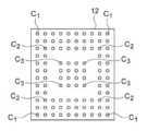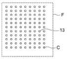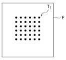 도 4A는 DUT(10)로 이루어진 전자 부품의 일례를 도시한 평면도이고, 볼 그리드 어레이형의 IC 칩을 볼 단자(납땜 범프)가 설치된 주면에서 바라본 도면이다. 즉, 도 1 ~ 도 3에 도시한 콘택트 아암(300)의 홀드부(380)에 흡착 홀드된 IC 칩을 하면에서 제 2 카메라(221)에 의해 촬상한 경우의 도면에 해당한다. 도 4A에 도시한 상대적으로 작은 전자 부품을 제 1 전자 부품(11), 도 4B에 도시한 상대적으로 큰 전자 부품을 제 2 전자 부품(12)이라고 한다. 일반적으로 볼 그리드 어레이형 IC 칩의 볼 단자(13)는 도 4A에 도시한 바와 같이, 격자 모양으로 규칙적으로 배열되어 있지만, 지그재그 형으로 배열된 볼 그리드 어레이형 IC 칩 이어도 좋다. 도 4A의 점선 테두리(F)는 제 2 카메라(221)에 의한 촬상 범위를 나타낸다. 이 제 1 전자 부품(11)에 대하여는 제 2 카메라(221)의 시야각을 고려하여 제 2 카메라(221)의 촬상 범위에 모든 볼 단자(13)가 들어가도록 그 고정 위치가 설정되어 있다. 도 8A는 정렬 장치(200)의 제 2 카메라(221)를 이용한 제 1 전자 부품(11)의 자세 검출 처리를 도시한 흐름도이다.Fig. 4A is a plan view showing an example of an electronic component composed of the