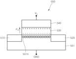 도 5a 및 도 5b는 강유전성 메모리 장치의 동작 원리를 개략적으로 설명하는 도면이다도 5a 및 도 5b를 참조하면, 강유전성 메모리 장치(500)는 기판(501), 강유전층(530), 및 게이트 전극층(540)을 구비한다. 게이트 전극층(540)의 양단의 기판(501) 영역에 소스 영역(510)과 드레인 영역(520)이 각각 배치될 수 있다. 기판(501)은 p형으로 도핑된 반도체 기판일 수 있으며, 소스 영역(510)과 드레인 영역(520)은 n형으로 도핑된 기판(501)의 영역일 수 있다.5A and 5B are views schematically illustrating the operating principle of the ferroelectric memory device. Referring to FIGS. 5A and 5B, the