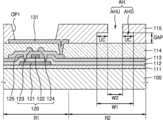 표시소자는 발광영역(R1)에 배치되고, 화소회로는 발광영역(R1) 및/또는 발광영역(R1) 주변의 비발광영역(R2)에 배치될 수 있다. 발광영역(R1)은 표시소자의 제1 전극 또는 발광층이 배치된 영역으로 정의될 수 있다.The display element may be disposed in the light emitting region R1, and the pixel circuit may be disposed in the light emitting region R1 and/or the non-light emitting region R2 around the light emitting region R1. The light emitting region R1 may be defined as a region where the first electrode or light emitting layer of the display device is disposed.