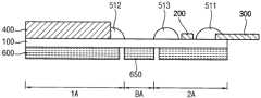 도 13을 참조하면, 선벤딩보호층 형성 물질을 가요성 인쇄회로기판(300)이 배치된 제2 영역(2A)의 단부, 벤딩 영역(BA)에 인접한 제1 영역(1A) 및 벤딩 영역(BA)에 인접한 제2 영역(2A)에 도포하고, 이를 경화하여 제1 선벤딩보호층(511), 제2 선벤딩보호층(512) 및 제3 선벤딩보호층(513)을 형성할 수 있다. 여기서, 제1 선벤딩보호층(511)의 높이를 제3 선벤딩보호층(513)의 높이보다 낮게 형성하여 후속 공정에서 제1 후벤딩보호층(521)의 높이와 제2 후벤딩보호층(522)의 높이를 상이하게 형성할 수 있다.Referring to FIG. 13, a material for forming a pre-bending protective layer is applied to the end of the