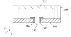 [0065]차단기 플레이트(350)는 하우징(310)과 전기 연통한다.  도 7의 도면에 도시된 바와 같이, 몇몇 실시예들의 차단기 플레이트(350)는, 필드(356)를 정의하는, 내측 둘레 에지(351), 외측 둘레 에지(352), 제1 측(353), 및 제2 측(354)을 갖는다.  세장형 슬롯(355)은 필드(356) 내에 로케이팅되고, 차단기 플레이트(350)의 두께(357)를 통해 연장된다.  세장형 슬롯(355)은 길이(L) 및 폭(W)을 갖는다.  슬롯은 선형, 곡선형, 웨지-형상, 또는 타원 형상일 수 있다.  이와 관련하여 사용되는 바와 같이, 선형 슬롯은, 에지들 사이의 평균 거리에 대해 5% 초과만큼 변하지 않는 거리만큼 서로 이격되는 세장형 에지들을 갖는다.  슬롯이 만곡된 단부들을 갖는 경우, 슬롯의 에지들 사이의 거리는 슬롯 길이의 중간 90%에 기반하여 결정된다.[0065] The