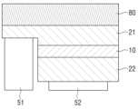 도 2b에 도시된 바와 같이, 버티컬 타입의 LED 소자 역시 발광층(10), n형 반도체층(21), p형 반도체층(22), n 전극(51) 및 p 전극(52)을 포함한다. 여기서 기판(80)은 도전성 기판으로서, p 전극(52)의 역할을 수행한다. 버티컬 타입의 LED 소자의 경우에도 광이 방출되는 표면 상에 전극이 형성되어 있기 때문에, 전극에 의한 차광 효과에 의한 광추출 효율의 감소 문제가 있으며, 또한 LED 소자의 상부에 위치하는 전극과 구동 기판을 상호 연결하는데 있어서 공정 비용이 발생하는 것 역시 레터럴 타입의 LED 소자의 경우와 같다.As shown in FIG. 2B, the vertical type LED device also includes a