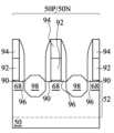 LDD 영역을 형성하기 위한 주입은 또한 더미 핀(62)에 불순물을 주입할 수 있다. 예를 들어, 더미 핀(62)이 p형 영역(50P)에 형성될 때, 더미 핀(62)의 상부 부분(예를 들면, STI 영역(66)의 표면보다 높은 더미 핀(62)의 부분)에는 p형 영역(50P)에 주입된 p형 불순물이 주입될 수 있다. 마찬가지로, 더미 핀(62)이 n형 영역(50N)에 형성될 때, 더미 핀(62)의 상부 부분(예를 들면, STI 영역(66)의 표면보다 높은 더미 핀(62)의 부분)에는 n형 영역(50N)에 주입된 n형 불순물이 주입될 수 있다.Implantation to form the LDD region may also implant impurities into the