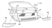 후방 램프 조립체(510)는 적어도 하나의 적절한 미리 결정된 광원(538)을 갖는다.  바람직하게는, 후방 램프 조립체(510)는 발광 다이오드(LED) 램프 조립체이다.  적어도 하나의 반사기(540)는 바람직하게는 복수의 체결구(542)에 의해 하우징(528)에 연결된다.  복수의 광원(538)은 제1 인쇄 회로 기판(544), 예를 들어 LED 인쇄 회로 기판에 작동 가능하게 연결된다.  적어도 하나의 확산기 베젤(546)은 일반적으로 인쇄 회로 기판(544)과 램프 렌즈(548) 사이에 위치된다.  제2 인쇄 회로 기판(550), 예를 들어 LED 인쇄 회로 기판은 적어도 하나의 와이어 점퍼(532) 부착물(532a) 및 제1 광 파이프 부분(552)에 작동 가능하게 연결된다.  제3 인쇄 회로 기판(554), 예를 들어, LED 인쇄 회로 기판은 적어도 하나의 와이어 점퍼(532) 부착물(532b) 및 제2 광 파이프 부분(556)에 작동 가능하게 연결된다.