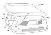 대안적으로, 내부 패널(412)은 미리 결정된 위치 또는 평면, 예를 들어 상부 길이방향 평면에서 등각 표면을 갖는다.  로우 프로파일 등각 램프와 등각 표면 및 재료가 대응하여 D-필러의 강성을 더 크게 만든다.  기하형상과 재료를 고려한다.  바람직하게는, "I"는 미리 결정된 높이, 가장 바람직하게는 내부 패널 및 리프트 게이트의 내부 영역과 같은 기하형상이다.  바람직하게는, "E"는 미리 결정된 재료, 예를 들어 조성물의 강성이다.  예를 들어, 수학식 I = bh3/12(예를 들어, b = 폭이고 h = 높이).  바람직하게는, "I"는 20% 이상이다.  D-필러 강성에 관하여, 통상적으로, 필러는 내부 패널(414) 및 라이트 하우징(428) 상의 미리 결정된 등각 표면으로 인해 두껍게 유지되는데, 이는 라이트 하우징(428)이 더 얕은 깊이를 가질 수 있게 한다.  일반적으로, 강성 강도는 깊이에 대해 입방 관계이다.Alternatively, the