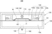 한편, 본 발명의 실시예들에 따른 표시 장치의 제조 장치는 제1 지그(120)의 좌측과 우측에 각각 하나씩의 지지부(122)가 설치된 모습을 나타내나, 본 발명의 실시예들은 이에 한정되지 않는다. 즉, 도면에 도시하지는 않았으나 지지부(122)는 제1 지그(120)의 좌측 및 우측 중 적어도 일측에 설치될 수 있다. 만약 지지부(122)가 제1 지그(120)의 좌측 및 우측 중 적어도 일측에 설치되는 경우, 지지부(122)가 설치되지 않은 제1 지그(120)의 타측에는 도면에 나타난 지지부(122)와 실질적으로 동일한 형태의 고정부(미도시)가 설치될 수 있으며, 이러한 고정부는 안착부(121)에 커버윈도우(W)가 안착되어 도 3에 나타난 바와 같이 커버윈도우(W)와 패널부재(P)가 마주볼 경우 커버윈도우(W)가 하측으로 낙하하지 않도록 고정하는 역할을 수행할 수 있다. 다만, 이하에서는 설명의 편의를 위해 제1 지그(120)의 좌측 및 우측에 각각 하나씩의 지지부(122)가 설치된 경우를 중심으로 설명하기로 한다.Meanwhile, the display device manufacturing apparatus according to the embodiments of the present invention shows one