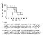 도 7: NOD-SCID 마우스에서 라지(Raji)-luc 공동-생착 모델 내에서 CD3xCD20이중특이적 항체의 세포독성활성.  (a) 표시된 용량하에 비히클 (PBS) 또는 bsIgG1-huCD3-H1L1-FEALxCD20-7D8-FEAR로 처리시킨 마우스 내에서의 평균 종양 크기.  오차 막대는 S.E.M.을 표시한다.  (b) 종양 접종 후 제21일에 PBS 또는 bsIgG1-huCD3-H1L1-FEALxCD20-7D8-FEAR로 처리시킨 후 개개의 마우스 내에서의 종양 크기.  제21일에 데이터의 통계적 분석은 크러스칼 왈리스(Kruskal Wallis) [사후 시험으로서 던(Dunn)의 다중 비교]를 이용하여 수행하였다. **p<0.01.  (c) 600 mm3에서 설정된 종양 크기 컷-오프를 수반한 카플란-마이어(Kaplan-Meier) 플롯.  bsIgG1-huCD3-H1L1-FEALxCD20-7D8-FEAR-처리된 군과 PBS-처리된 대조군 간의 생존 상의 차이의 통계적 유의성은 만텔 콕스(Mantel Cox) 분석에 의해 평가하였다.  *p<0.05, **p<0.01, n.s. 유의적이지 않음.  (d) 표시된 용량하에 비히클 (PBS) 또는 bsIgG1-huCLB-T3/4-FEALxCD20-7D8-FEAR로 처리시킨 마우스 내에서의 평균 종양 크기.  오차 막대는 S.E.M.을 표시한다.  (e) 종양 접종 후 제25일에 상이한 처리군에서 개개의 마우스 내에서의 종양 크기.  통계적 분석은 크러스칼 왈리스 시험 (사후 시험으로서 던의 다중 비교)를 이용하여 수행하였다. (f) 500 mm3에서 설정된 종양 크기 컷-오프를 수반한 카플란-마이어 플롯.  처리군과 비히클 대조군 간의 차이의 통계적 유의성은 만텔 콕스 분석에 의해 분석하였다.  *p<0.05, **p<0.01, n.s. 유의적이지 않음.  (g) 표시된 용량하에 비히클 (PBS), bsIgG1-huCD3-H1L1-FEALxCD20-7D8-FEAR 또는 bsIgG1-huCD3-H1L1-FEALxCD20-11B8-FEAR로 처리시킨 마우스 내에서의 평균 종양 크기.  오차 막대는 S.E.M.을 표시한다.  (h) 종양 접종 후 제20일에 PBS, 또는 bsIgG1-huCD3-H1L1-FEALxCD20-7D8-FEAR 또는 bsIgG1-huCD3-H1L1-FEALxCD20-11B8-FEAR로 처리시킨 후 개개의 마우스 내에서의 종양 크기.  제20일에 데이터의 통계적 분석은 일방향 ANOVA [사후 시험으로서 터키(Tukey)의 다중 비교]를 이용하여 수행하였다. *p<0.05, **p<0.01.  (i) 500 mm3에서 설정된 종양 크기 컷-오프를 수반한 카플란-마이어 플롯.  bsIgG1-huCD3-H1L1-FEALxCD20-7D8-FEAR-처리된 군과 PBS-처리된 대조군 간의 생존 상의 차이의 통계적 유의성은 만텔 콕스 분석에 의해 평가하였다.  *p<0.05, **p<0.01, n.s. 유의적이지 않음.