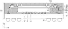 제1 반도체 칩(102)은 일 예로 애플리케이션 프로세서(AP) 칩을 포함할 수 있다. 제1 반도체 칩(102)은 제1 반도체 칩(102)의 하면에 부착된 복수개의 범프들(BP)을 통하여 제1 패키지 기판(101)과 전기적으로 연결될 수 있다. 제1 반도체 칩(102)의 하면은 활성면으로 기능할 수 있다. 제1 반도체 칩(102)의 상면은 비활성면일 수 있다. 제1 반도체 칩(102)은 플립칩 본딩(flipchip bonding) 방식으로 제1 패키지 기판(101)에 실장될 수 있다.The first semiconductor chip (102) may include, for example, an application processor (AP) chip. The first semiconductor chip (102) may be electrically connected to a first package substrate (101) through a plurality of bumps (BP) attached to a lower surface of the first semiconductor chip (102). The lower surface of the first semiconductor chip (102) may function as an active surface. The upper surface of the first semiconductor chip (102) may be an inactive surface. The first semiconductor chip (102) may be mounted on the first package substrate (101) by a flipchip bonding method.