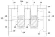 상부 게이트(122)는 게이트시트저항을 낮추기 위해 저저항 물질일 수 있다. 상부 게이트(122)는 금속-베이스 물질일 수 있다. 상부 게이트(122)는 금속, 금속질화물 또는 이들의 조합을 포함할 수 있다. 상부 게이트(122)는 탄탈륨질화물(TaN), 티타늄질화물(TiN), 텅스텐, 텅스텐질화물 또는 이들의 조합을 포함할 수 있다. 상부 게이트(UB)는 티타늄질화물 단독으로 형성될 수 있다. 또한, 상부 게이트(UB)는 티타늄질화물과 텅스텐의 스택(즉, TiN/W)으로 형성될 수 있다. 일부 실시예에서, 하부 게이트(121)와 상부 게이트(122)는 각각 티타늄질화물 단독으로 형성될 수 있다. 또한, 하부 게이트(121) 및 상부 게이트(122)는 각각 티타늄질화물과 텅스텐의 스택(TiN/W)으로 형성될 수 있다. 상부 게이트(122)는 하부 게이트(121)보다 낮은 높이를 가질 수 있고, 이에 따라 트렌치(105) 내에서 차지하는 하부 게이트(121)의 체적이 더 클 수 있다.The upper gate (122) may be a low-resistance material to lower the gate sheet resistance. The upper gate (122) may be a metal-based material. The upper gate (122) may include a metal, a metal nitride, or a combination thereof. The upper gate (122) may include tantalum nitride (TaN), titanium nitride (TiN), tungsten, tungsten nitride, or a combination thereof. The upper gate (UB) may be formed of titanium nitride alone. Additionally, the upper gate (UB) may be formed of a stack of titanium nitride and tungsten (i.e., TiN/W). In some embodiments, the lower gate (121) and the upper gate (122) may each be formed of titanium nitride alone. Additionally, the lower gate (121) and the upper gate (122) may each be formed of a stack of titanium nitride and tungsten (TiN/W). The upper gate (122) may have a lower height than the lower gate (121), and thus the volume of the lower gate (121) occupied within the trench (105) may be larger.