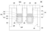 상부 게이트(122)는 하부 게이트(121) 상에 형성될 수 있고, 상부 게이트(122)의 상부 표면은 활성영역(104)의 상부 표면보다 낮은 레벨일 수 있다. 상부 게이트(122)는 트렌치(105)의 중간부를 부분적으로 채우는 형상일 수 있다. 상부 게이트(122)와 하부 게이트(121)는 동일 물질이거나 서로 다른 물질일 수 있다.The upper gate (122) may be formed on the lower gate (121), and the upper surface of the upper gate (122) may be at a lower level than the upper surface of the active region (104). The upper gate (122) may have a shape that partially fills the middle portion of the trench (105). The upper gate (122) and the lower gate (121) may be made of the same material or different materials.