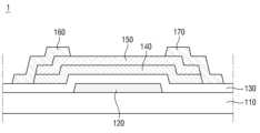 소스 전극(160) 및 드레인 전극(170)은 단층 또는 다층으로 이루어질 수 있다. 소스 전극(160) 및 드레인 전극(170)이 단층인 경우, 몰리브덴(Mo), 알루미늄(Al), 백금(Pt), 팔라듐(Pd), 은(Ag), 마그네슘 (Mg), 금(Au), 니켈(Ni), 네오디뮴(Nd), 이리듐(Ir), 크롬(Cr), 티타늄(Ti), 탄탈륨(Ta), 텅스텐(W) 또는 구리(Cu) 중 선택된 어느 하나 또는 이들의 합금을 포함할 수 있다. 또한, 소스 전극(160) 및 드레인 전극(170)이 다층인 경우, 구리/티타늄 또는 몰리브덴/알루미늄-네오디뮴의 2층, 티타늄/알루미늄/티타늄, 몰리브덴/알루미늄/몰리브덴 또는 몰리브덴/알루미늄-네오디뮴/몰리브덴의 3층으로 이루어질 수 있다.The source electrode (160) and the drain electrode (170) may be formed of a single layer or multiple layers. When the source electrode (160) and the drain electrode (170) are a single layer, they may include one selected from molybdenum (Mo), aluminum (Al), platinum (Pt), palladium (Pd), silver (Ag), magnesium (Mg), gold (Au), nickel (Ni), neodymium (Nd), iridium (Ir), chromium (Cr), titanium (Ti), tantalum (Ta), tungsten (W), or copper (Cu), or an alloy thereof. In addition, when the source electrode (160) and the drain electrode (170) are multilayered, they may be formed of two layers of copper/titanium or molybdenum/aluminum-neodymium, three layers of titanium/aluminum/titanium, molybdenum/aluminum/molybdenum, or molybdenum/aluminum-neodymium/molybdenum.