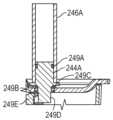 언급된 바와 같이, 받침대(244G)는 바이알(240G)이 안착될 수 있는 받침대를 포함할 수 있고 받침대(244G)는 모터(308) 또는 다른 모터(예컨대, 도 4b의 모터(248B))로부터의 전력 하에 회전하도록 구성될 수 있다. 받침대(244G)는 추가적으로 슬리브(246G)를 수용하기 위한 플랜지(312G)를 포함할 수 있다. 받침대(244G)는 베이스(232)의 웰(314G) 내에 놓일 수 있다. 웰(314G)은 받침대(244G)가 이를테면 샤프트 또는 자기 커플링을 통해 모터(308)와 인터페이싱하도록 위치될 수 있는 베이스(232) 내의 로케이션일 수 있다. 예들에서, 모터(308)는 턴테이블 시스템의 부분을 포함할 수 있다. 웰(314G)은 받침대(244G)보다 클 수 있다. 받침대(244G)는 베이스(232)에 해제 가능하게 부착되도록 구성될 수 있다. 이와 같이, 캐러셀(204)은 상이한 사이즈들의 프로토콜의 컴포넌트들 또는 바이알들을 수용하기 위해 상이한 사이즈들의 받침대들을 수용하도록 구성될 수 있다. 예를 들어, 상이한 사이즈로 된 받침대들은 상이한 사이즈로 된 슬리브들 또는 튜브들을 수용하기 위해 상이한 사이즈로 된 플랜지들을 가질 수 있다. 슬리브 사이즈는, 예를 들어, 피펫팅을 용이하게 하기 위해 축(B)을 따라 곧게 선 자세로 바이알을 배향하기 위하여 바이알 사이즈에 밀접하게 일치할 수 있다. 받침대들은 받침대가 확고히 부착되었다는 촉각 피드백을 오퍼레이터에게 제공하기 위해, 제자리에 이를테면 스냅 특징부를 통해 유지되도록 구성될 수 있다. 상이한 사이즈로 된 받침대들은, 이를테면 컬러 코딩 또는 일부 다른 시스템 식별 시스템으로 분류될 수 있다. 유체 처리 시스템(200)은 제어 컴퓨터(108)에서 오퍼레이터에 의해 입력될 수 있는 것과 같이, 컴퓨터 판독가능 매체(108B)에 저장된 프로토콜을 교차 참조하기 위해 각각의 받침대 상의, 또는 캐러셀(204) 상의 코딩을 판독하도록 구성될 수 있다.As mentioned, the pedestal (244G) may include a pedestal upon which the vial (240G) may be seated and the pedestal (244G) may be configured to rotate under power from the motor (308) or another motor (e.g., motor (248B) of FIG. 4B). The pedestal (244G) may additionally include a flange (312G) for receiving a sleeve (246G). The pedestal (244G) may be disposed within a well (314G) of the base (232). The well (314G) may be a location within the base (232) where the pedestal (244G) may be positioned to interface with the motor (308), such as via a shaft or magnetic coupling. In examples, the motor (308) may comprise part of a turntable system. The well (314G) may be larger than the pedestal (244G). The pedestals (244G) may be configured to be releasably attached to the base (232). As such, the carousel (204) may be configured to accommodate pedestals of different sizes to accommodate components or vials of different sizes of protocols. For example, the pedestals of different sizes may have flanges of different sizes to accommodate sleeves or tubes of different sizes. The sleeve size may closely match the vial size to, for example, orient the vial in an upright position along the axis (B) to facilitate pipetting. The pedestals may be configured to remain in place, such as via a snap feature, to provide tactile feedback to the operator that the pedestals are securely attached. The pedestals of different sizes may be identified, such as by color coding or some other system identification system. The fluid handling system (200) may be configured to read coding on each pedestal, or on the carousel (204), to cross-reference protocols stored on a computer readable medium (108B), such as may be entered by an operator into the control computer (108).