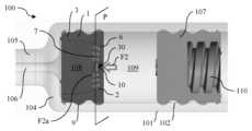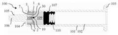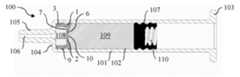 · 몸통의 내측에서 병진운동적으로 이동 가능하게 구성된, 몸통의 원위 단부와 플런저 스토퍼 사이에 배열된, 전술한 바와 같은 밸브 스토퍼로서, 밸브 스토퍼의 측방향 벽이 몸통의 내부 표면과 밀봉 가능하게 결합되는, 밸브 스토퍼를 포함한다.· A valve stopper as described above, arranged between a distal end of the body and a plunger stopper, configured to be translationally movable inside the body, wherein a lateral wall of the valve stopper is sealingly coupled with an inner surface of the body.