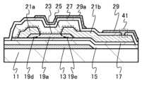 또한, 도전막(21b)은, 개구부(41)에 있어서, 화소 전극으로서 기능하는 투광성을 갖는 도전막(29)과 전기적으로 접속되어 있다.In addition, the conductive film (21b) is electrically connected to a conductive film (29) having light-transmitting properties that functions as a pixel electrode in the opening (41).