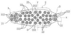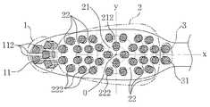 상기 전단부(1)의 후방에 위치한 중앙부(2)에는 칫솔의 길이방향인 x축과 칫솔헤드의 전단으로부터 2/3 지점의 y축이 교차하는 지점을 중심점(o)으로 한 제1원호(21) 상의 식모구멍에 칫솔모다발을 직립하여 식모한 직립모다발을 형성하는데, 가장 바람직하게는 상기 제1원호(21)와 x축 및 y축이 만나는 지점의 식모구멍에 칫솔모다발을 직립하여 직립모다발(212)을 형성하는 것이 좋다.A