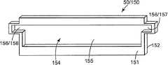일 실시예에 있어서, 단일 내부 층(150)은 내부에 형성된 유체 통로(154)를 갖는다.  유체 통로(154)는 예를 들어 단일 내부 층(150)의 제 1 측부(151) 및 제 2 측부(152)와 연통하고, 단일 내부 층(150)의 대향 단부 사이로 연장하는 개구(155)를 포함한다.  그러한 것으로서, 외부 층(30, 40)이 단일 내부 층(150)의 대향 측 상에 위치될 때, 유체 통로(154)는 단일 내부 층(150)을 통해 외부 층(30, 40)의 유체 경로(80)에 유체를 분배한다.In one embodiment, the single inner layer 150 has a