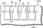 일 실시예에 있어서, 유체 경로(80)는 각 외부 층(30, 40)의 측부(32, 42) 상에 형성된 배리어(barrier)(82)의해 규정된다.  그러한 것으로서, 외부 층(30, 40)이 내부 층(50)의 대향 측 상에 위치될 때, 내부 층(50)(도 2) 및 외부 층(30)의 유체 경로(80)는 에지(34)를 따라 노즐(13)의 열(61)을 형성하고, 내부 층(50)(도 2) 및 외부 층(40)의 유체 경로(80)는 에지(44)를 따라 노즐(13)의 열(62)을 형성한다.In one embodiment, the
