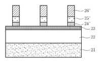 도 2a 및 도 2b를 참조하면, 반도체 기판(21) 상부에 비정질 탄소층(22), SiON층(23), 폴리하드마스크층(24), 제1 반사방지막(25) 및 제1 감광막(26)을 순차적으로 형성한 후, 제1 노광마스크(미도시)를 이용하여 전체 표면의 제1 영역을 노광하고, 노광된 제1 감광막(26)을 현상하여 제1 감광막 패턴(26')을 형성한다. 이때, 포지티브 톤의 이중 패터닝 공정이므로 라인 부분이 좁은 형태로 패턴이 형성된다. 상기 제1 감광막 패턴(26')을 식각방지막으로 하부 제1 반사방지막(25) 및 폴리하드마스크층(24)을 식각하여 폴리하드마스크 패턴(24')을 형성한다.2A and 2B, an
