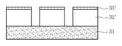 도 3c를 참조하면, 상기 제1 감광막 패턴(34')을 식각방지막으로 하부 제1 반사방지막(33)을 식각하여 제1 반사방지막 패턴(33')을 형성하고, 제1 반사방지막 패턴(33')을 식각방지막으로 하부 C-리치 폴리머층(32)을 식각하여 C-리치 폴리머층 패턴(32')을 형성한다. 이때, 제1 반사방지막(33) 식각시에는 CF4, O2 가스를 단독으로 사용하거나 또는 이들을 조합하여 사용하는 것이 바람직하며, C-리치 폴리머층(32) 식각시에는 O2, N2, H2 가스를 단독으로 사용하거나 또는 이들을 조합하여 사용하는 것이 바람직하다. C-리치 폴리머층의 식각이 완료되었을 때 C-리치 폴리머층 패턴(32') 위에는 제1 반사방지막 패턴(33')이 약간 남아 있을 수도 있다.Referring to FIG. 3C, the lower