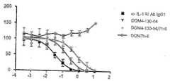 도 2 및 도 3은는 배양된 MRC-5 세포 (ATCC 가탈로그 CCL-171)로부터 IL-1-유도된 IL-8 방출을 억제하는 능력에 대해 친화력 성숙된 dAb를 시험한 시험관내 검정 결과를 도시하는 그래프이다. 도 2는 DOM4-130의 친화력 성숙된 변이체인 DOM4-130-3에 대한 용량-반응 곡선을 도시한다. 상기 검정에서 DOM4-130-3의 ND50은, 500 내지 1000 nM인 DOM4-130의 ND50과 비교하여, 약 30 nM이었다 (도 1 참조). 도 3은 DOM4-130의 친화력 성숙된 변이체인 DOM4-130-46 및 DOM4-130-51, 및 인터루킨 1 수용체 길항제(IL-1ra)에 대한 용량-반응 곡선을 도시한다. 상기 검정에서 DOM4-130-46의 ND50은 약 1 nM이었고, DOM4-130-51의 ND50은 약 300 pM이었다.2 and 3 show the results of in vitro assays testing affinity matured dAbs for their ability to inhibit IL-1-induced IL-8 release from cultured MRC-5 cells (ATCC catalog CCL-171). It is a graph. 2 shows a dose-response curve for DOM4-130-3, an affinity matured variant of DOM4-130. The ND50 of DOM4-130-3 in this assay was about 30 nM, compared to the ND50 of DOM4-130 which is 500-1000 nM (see FIG. 1). FIG. 3 shows dose-response curves for the affinity matured variants of DOM4-130, DOM4-130-46 and DOM4-130-51, and
