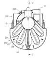 이와 같이, 그릴필터(116)로 유입된 공기는 계속해서 유입공(131)을 통해 2차 사이클론부(130)로 유입된다. 이어서 공기는 다수의 안내채널(132)을 따라 다수 의 콘(133)으로 각각 유입된 후, 소정의 선회력이 부여된 상태로 다수의 콘(133) 내부에서 선회한다. 이에 따라 미세먼지는 원심력에 의해 공기와 분리된 후 낙하하여 먼지수거통(300)의 2차 먼지수거챔버(350)로 수거되며, 미세먼지와 분리된 공기는 다수의 배출관(211)을 통해 각각 다수의 콘(133)으로부터 제2 커버(230)의 합류챔버(231)로 배출된다.As such, the air introduced into the