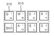 인접한 문자키(310)에 서로 다른 숫자가 할당되어 있을 때 인접한 두 개의 문자키(310)가 함께 눌리거나 의도한 것과 다른 문자키(310)가 눌리게 되어 숫자가 잘못 출력되는 경우가 발생할 수 있다. 따라서 서로 다른 키 그룹(610) 간의 구별을 위한 또 다른 방법으로서 숫자가 할당된 문자키(310)에 인접한 적어도 하나의 다른 문자키(310)에는 숫자를 할당하지 아니하여 문자키(310)가 잘못 눌리더라도  의도한 것과 다른 숫자가 출력되는 것을 방지할 수 있다.When different numbers are assigned to the