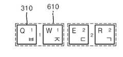 각 문자키(310)에는 문자의 최소 단위인 한글의 자음 및 모음 또는 영어의 알파벳이 할당되어 있으며, 'shift' 또는 'tab' 등의 기능키와 ',' 또는 '?' 등의 특수문자키 역시 문자키(310)에 해당한다. 또한 숫자키에는 0에서 9까지의 숫자가 각각 할당되어 매트릭스 형태로 배열되어 있다. 도 3a 내지 도 3c는 문자키(310)에  할당된 문자의 최소 단위와 숫자키(320)에 할당된 숫자의 예를 도시한 것이므로 문자키(310)와 숫자키(320)는 도 3a 내지 도 3c에 도시된 바와 다르게 배열될 수 있으며, 배열 형태도 도 3a 내지 도 3c에 도시된 바와 같은 매트릭스 형태뿐 아니라 일반적인 키보드에서 문자키(310)와 숫자키(320)가 배열된 형태와 동일하게 행방향으로는 일직선상에 위치하고, 종방향으로는 비스듬한 형태로 배열되도록 할 수 있다.Each