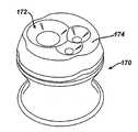 도 7a 및 도 7b에 도시된 다른 실시예에서, 수술용 접근 디바이스(170)는 밀봉부 베이스(174)에 형성된 포트(180) 내에 회전 가능하게 안착된 회전 가능 밀봉 포트(172)를 포함할 수 있다.  밀봉 포트(172)는 밀봉 요소(178)가 포트 하우징(180)과의 그 각도 배향을 변경할 수 있게 하는 하나 이상의 짐벌 기구(176)를 가질 수 있다.  짐벌 기구(176)는 예를 들어 밀봉 요소(177)가 그를 가로질러 연장하는 상태로 이들 사이로 연장하는 개구와 평탄한 상부 및 저부 부분을 갖는 일반적으로 구형 부재일 수 있다.  도시된 바와 같이, 짐벌(176) 및 밀봉 요소(178)는 다방향 각도 변위가 가능하도록 포트 하우징(180) 내에서 다축방향으로 회전할 수 있다.  도 7b에 도시된 바와 같이, 짐벌(176) 및 따라서 밀봉 요소(178)의 피벗 이동은 밀봉 요소(178)의 중심 종축을 변경하는 효과가 있어, 그를 통해 삽입된 도구를 위한 더 큰 조작성을 허용한다.In other embodiments shown in FIGS. 7A and 7B, the