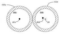 도시된 실시예들에서, 오리피스(66)는 필수적인 요건은 아니지만 실질적으로 환상의 대칭체이다.  이 오리피스(66)는 노즐(64)의 근위 표면(70a)에 대해 일정한 각도로 형성될 수 있지만 필수적인 것은 아니다.  이 각도는 약 0 도(예, 오리피스가 근위 표면(70a)에 대해 실질적으로 수직한 경우), 약 10 도, 약 20 도, 약 30 도, 약 40 도, 약 50 도, 약 60 도, 또는 일부의 다른 각도일 수 있다.  도 5a 및 도 5b에 도시된 오리피스(66)는 길이 L1 및 직경 D1을 갖는 실질적으로 원통상일 수 있는 근위 부분(68a)을 포함한다.  이 오리피스(66)는 원추각 α를 갖는 실질적인 원추체일 수 있고, 길이 L2 및 직경 D2를 가질 수 있는 원위 부분(68b)을 포함할 수 있다.  도 5b에서 개략적으로 도시된 바와 같이, 원추각 α는 약 180도일 수 있고, 원위 부분(68b)은 실질적으로 원통상이다.  직경 D2는 직경 D1과 다르지만 필수적인 것은 아니다.  예를 들면, 다양한 실시예들에서, D2는 D1과 대략 동일하거나 D2는 D1보다 크거나, 또는 D2는 D1보다 작을 수 있다.  길이 L2는 길이 L1과 다르지만 필수적인 것은 아니다.  예를 들면, 다양한 실시예들에서, L2는 L1과 대략 동일하거나, L2는 L1보다 크거나, 또는 L2는 L1보다 작을 수 있다.  도 5a 및 도 5b에 개략적으로 도시된 오리피스의 형상은 이 오리피스(66)를 통해 유동하는 액체의 속도의 비교적 급격한 변화를 유발할 수 있다.In the illustrated embodiments,