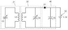 평활 회로(40)는 다이오드(D1)와 평활 캐패시터(C5)로 구성될 수 있으며, 교류 전력을 직류 전력으로 변환하여 출력한다. 부하(50)는 1.3V의 직류 전원으로 표시되어 있으나, 직류 전력을 필요로 하는 임의의 충전지 또는 장치일 수 있다.The